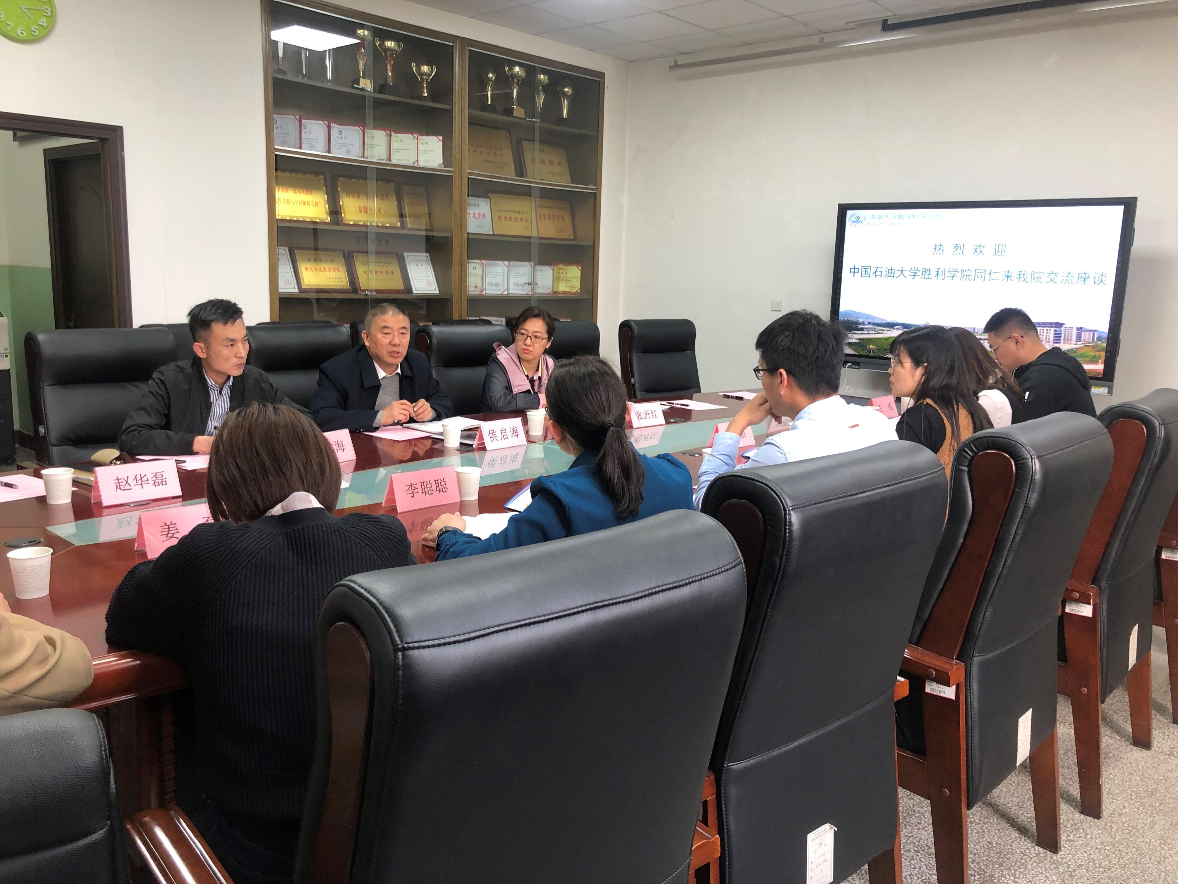 4月15日下午,中国石油大学胜利学院机械控制与工程学院党总支副书记张成明,油气工程学院党总支副书记李聪聪,教育与艺术学院党总支副书记王晶,机械控制与工程学院学工办主任姜磊,油气工程学院学工办主任王成,教育与艺术学院学工办主任胡洪翠,专职辅导员王兆婷一行来我院进行学生工作交流座谈。ok138cn太阳集团古天乐党委书记侯启海,ok138cn太阳集团古天乐党委副书记、副院长张沂红,团委书记赵华磊以及兄弟学院团委书记、辅导员参加座谈。
