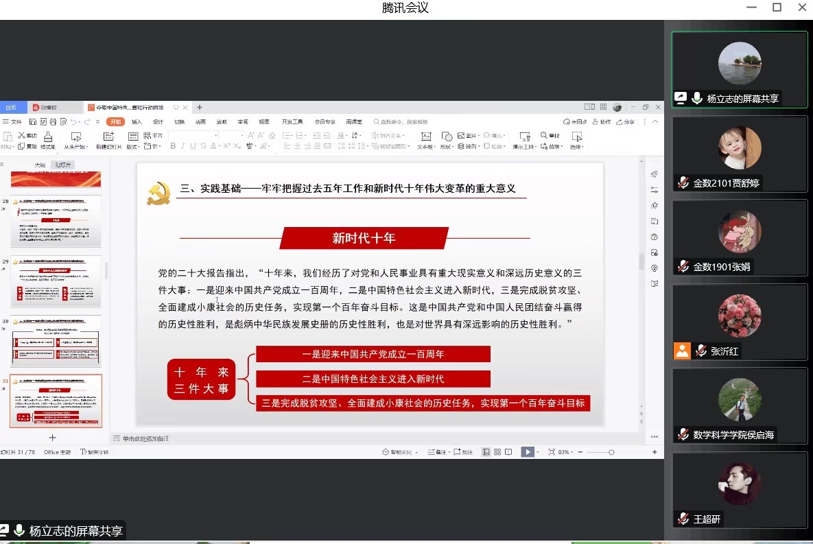11月22下午,学院邀请校宣讲团成员、山东高校思政课教学名师工作室主持人、马克思主义学院副院长杨立志教授为学院党委班子成员、全体学生党员、学院学生会和研究生会部长及以上成员、各年级各班全体学生干部等300余人宣讲党的二十大会议精神。杨教授作了题为《夺取中国特色社会主义新胜利的政治宣言和行动纲领》的专题报告。他从战略定位、大会主题、实践基础、理论指导、基本路径、根本保证、团结要求等七个方面全面解读了党的二十大报告的主要内容,并就中国特色社会主义道路生成逻辑、伟大建党精神的形成过程和丰富内涵、“五个牢牢把握”等相关内容作了深入讲解。学院党委副书记、副院长张沂红在主持学习活动时强调,深入学习宣传贯彻党的二十大精神是当前和今后一个时期的重要政治任务,广大师生党员、学生干部要通过全面深入的学习,不断提高政治站位,广泛凝聚思想共识,以强烈的政治责任感和历史使命感,坚定自信,团结奋斗,努力为开创学校工作新局面贡献力量。