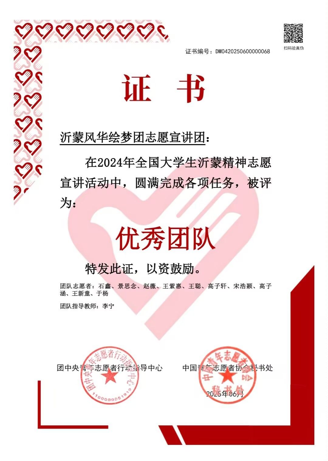 近日,团中央青年志愿者行动指导中心、中国青年志愿者协会秘书处联合表彰2024年全国大学生沂蒙精神志愿服务团队,ok138cn太阳集团古天乐“沂蒙风华绘梦团”志愿宣讲团在1000支大学生志愿服务团队中脱颖而出,荣获“优秀团队”称号。