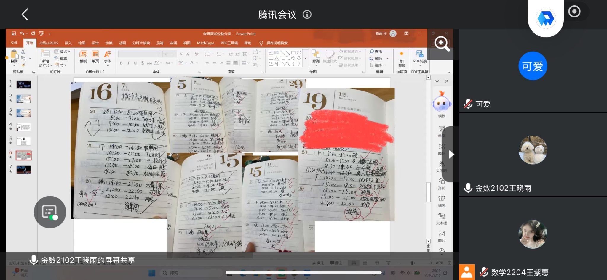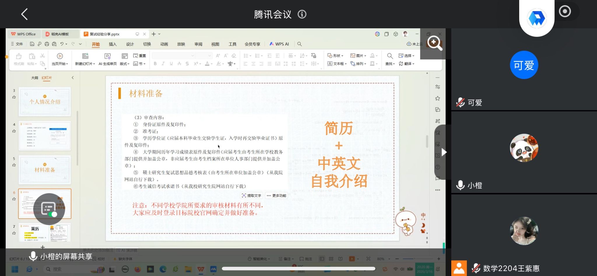 分享会上,庞诗卉首先聚焦面试核心能力,从心态、自我介绍、抽题应答等方面展开细致讲解,她强调答题需沉稳从容,遇熟题不躁、遇生题不慌,自我介绍需打磨中英文双版本,严格控制2-3分钟时长,突出个人优势并引导提问方向,针对时政类、日常类及英文专业类问题,她也给出灵活应对的方法,同时提醒大家面试时要保持大方自信,主动与老师交流互动。紧接着,王晓雨结合自身逆袭上岸的实战经历,从英语、笔试、面试三大模块分享备考方案,她以自身排名靠后却成功上岸的经历印证复试重要性,建议考生强化英语自我介绍背诵,尽早开展笔试复习并保持备考强度,借助模拟训练提升面试表现,同时梳理科研获奖经历、合理制定每日学习计划。最后,程政围绕复试全流程筹备与临场礼仪进行补充讲解,提醒大家密切关注院校官网通知,提前完成材料盖章等准备工作,精心制作涵盖学习与实践经历的个人简历,扎实复习专业课程,面试时注重礼仪细节、灵活应对未知问题,同时提前规划复试住宿,并鼓励排名靠后的同学坚定信心、全力冲刺逆袭。