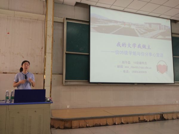 报告伊始,赵老师用自己在母校4+2本硕连读的经历向同学们强调了学习的重要性。赵老师从为什么在这里上大学,就业问题,交往礼仪等多个方面分享了自己的一些心得体会。她告诫新生们一定要关注自身的学业,兼顾职业生涯规划,更要养成谦逊的品质。随后,赵老师希望新生们可以书写大学的T字型生活,找到自身“横”与“竖”最合适的拐点,并坚持不懈地走下去。赵老师还希望新生要树立诚信意识,切忌出现考试作弊等违纪行为。