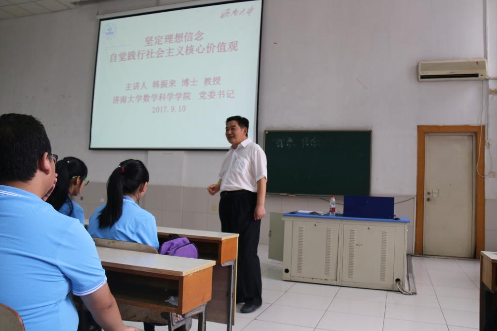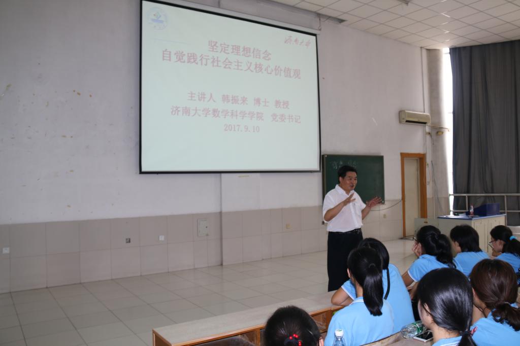 韩书记以习近平主席的讲话开篇,他告诫大家要时刻铭记社会主义核心价值观,坚定自己的理想和信念,努力学习知识,勇于创新实践,为社会贡献自己的一份力量。韩书记还为新生们分析了当代青年的现状,他讲道:“青年面临的选择很多,关键是要以正确的人生观、世界观、价值观来指导自己的选择,因此要坚定正确的理想信念,不怕吃苦,勇于奉献,才能收获美好的未来。”韩振来书记列举了很多生动而典型的例子,激励着新生们不懈追求自己的人生目标。韩书记还多次与新生进行了互动,让新生们用心交流、用心体悟理想和信念的力量。最后,韩书记向新生表达了自己的殷切希望,希望他们能尽快了解中国共产党,坚定信念,自觉践行社会主义核心价值观。