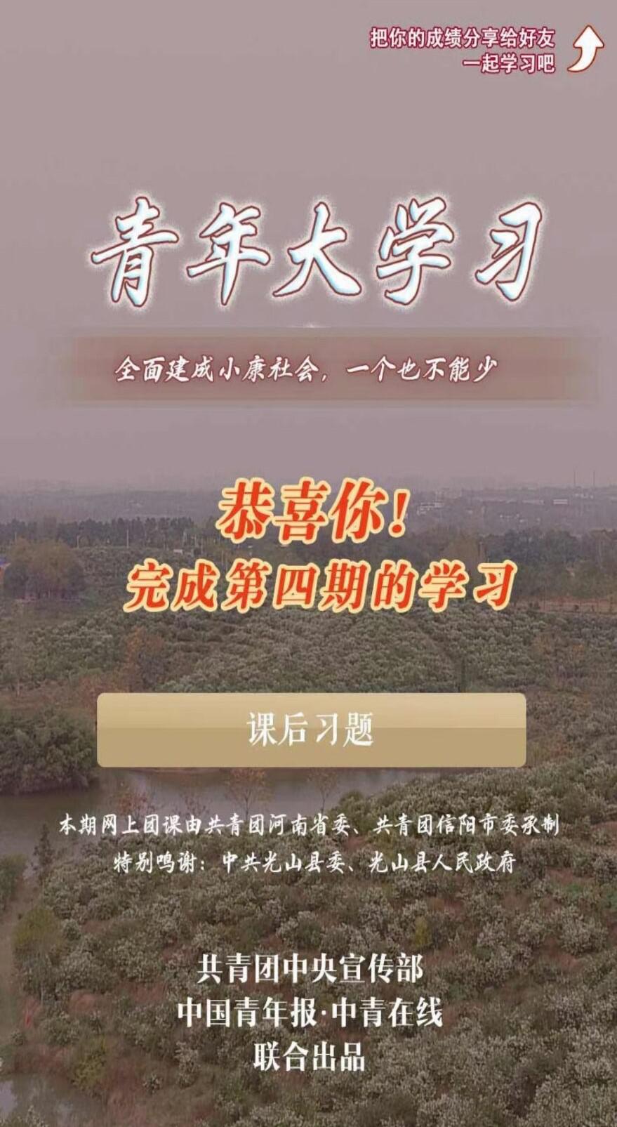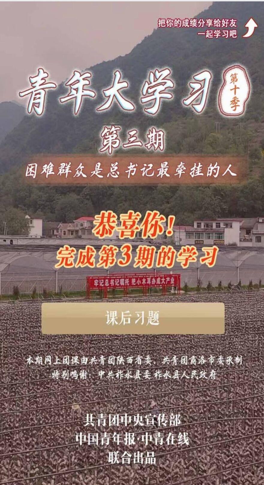 组织参与团中央“青年大学习”网上主题团课学习。认真学习习近平新时代中国特色社会主义思想、习近平总书记给全国青联学联的贺信、党的十九大精神和团情团史。通过学、测、评保证学习效果和覆盖面。“青年大学习”主题团课学习使广大青年思想水平得以提高,对共青团的认识上升到全新的高度。