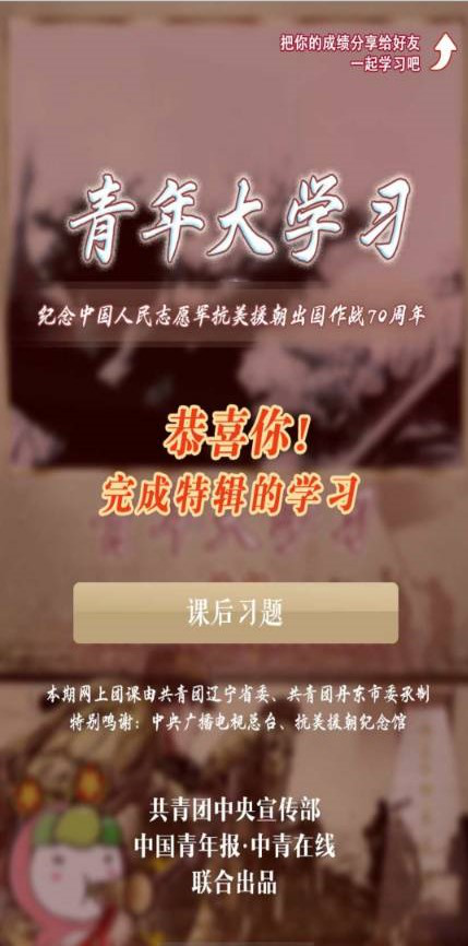 为深入学习习近平总书记关于抗美援朝重要讲话精神,着力发掘共青团组织在抗美援朝运动中的积极贡献,开展“聚焦主责主业,彰显青春担当”学习讨论活动,在基层团支部组织开展线上文字分享讨论、学习座谈、征文、知识竞赛、演讲比赛等多种形式且富有成效的主题团日活动。增强了班级团员的先进性、光荣感,使各班青年团员深入思考抗美援朝战争塑造形成的伟大抗美援朝精神。充分发挥了共青团是党联系青年的桥梁和纽带,引导青年思想,服务青年成长。
