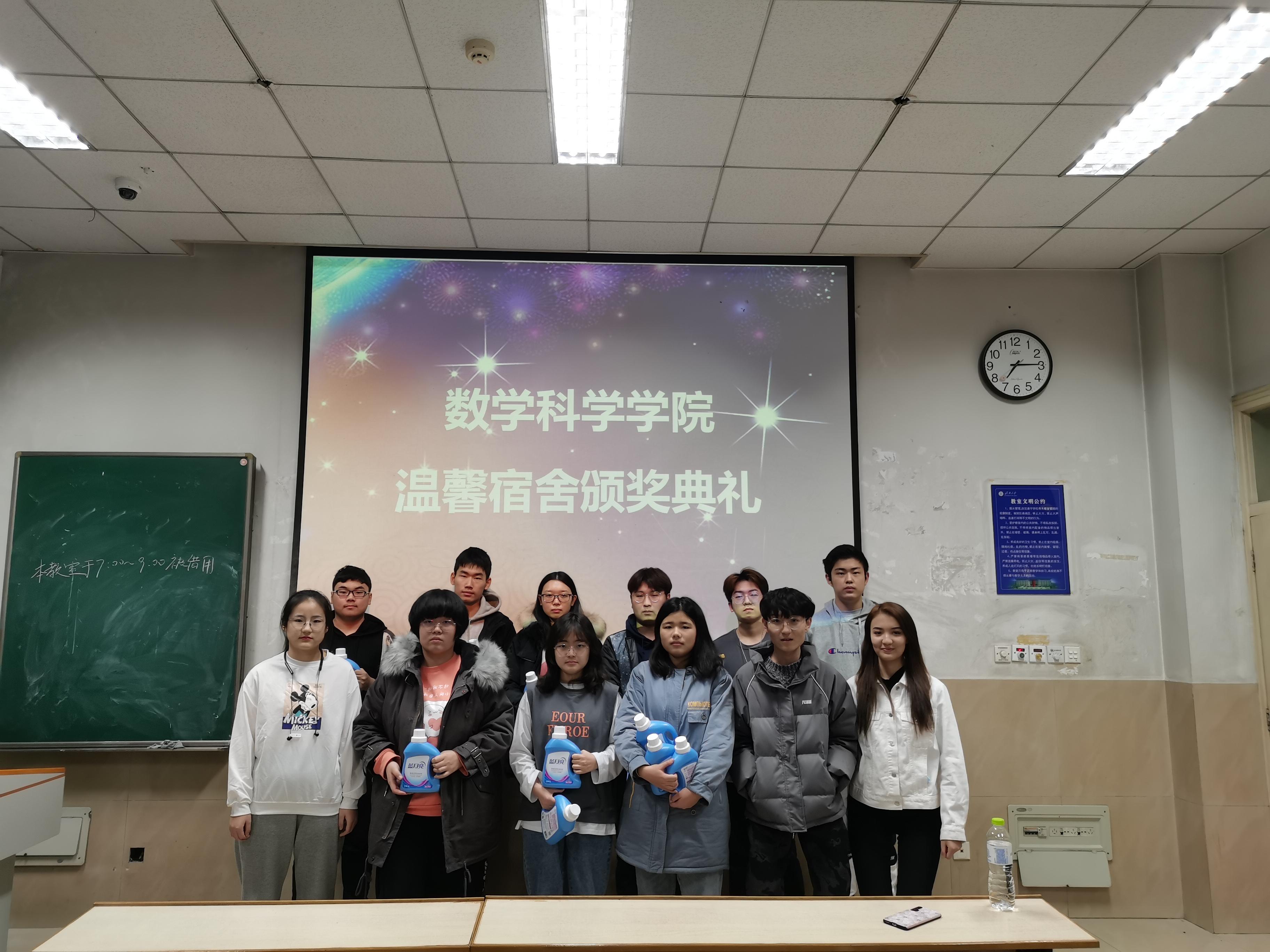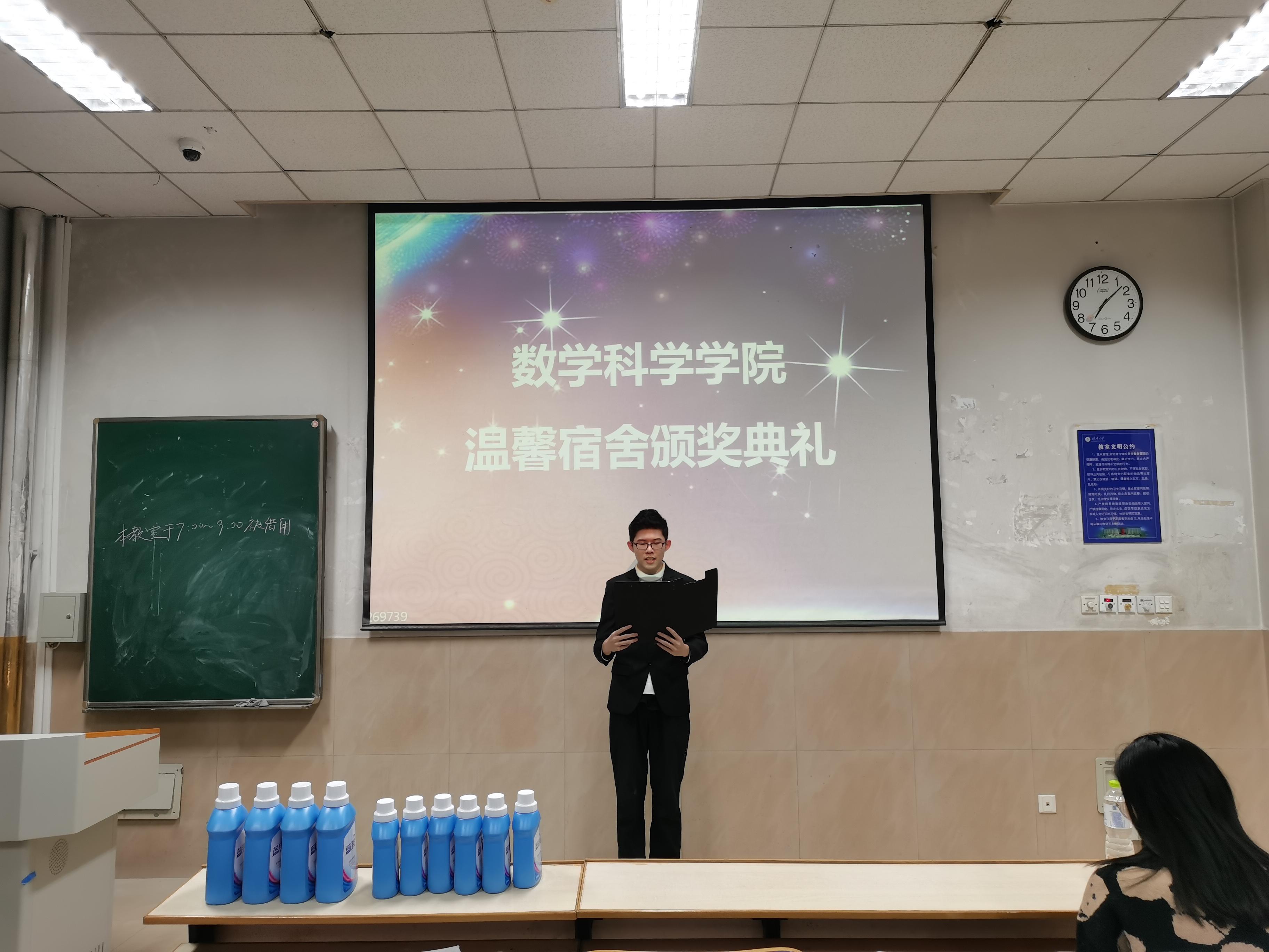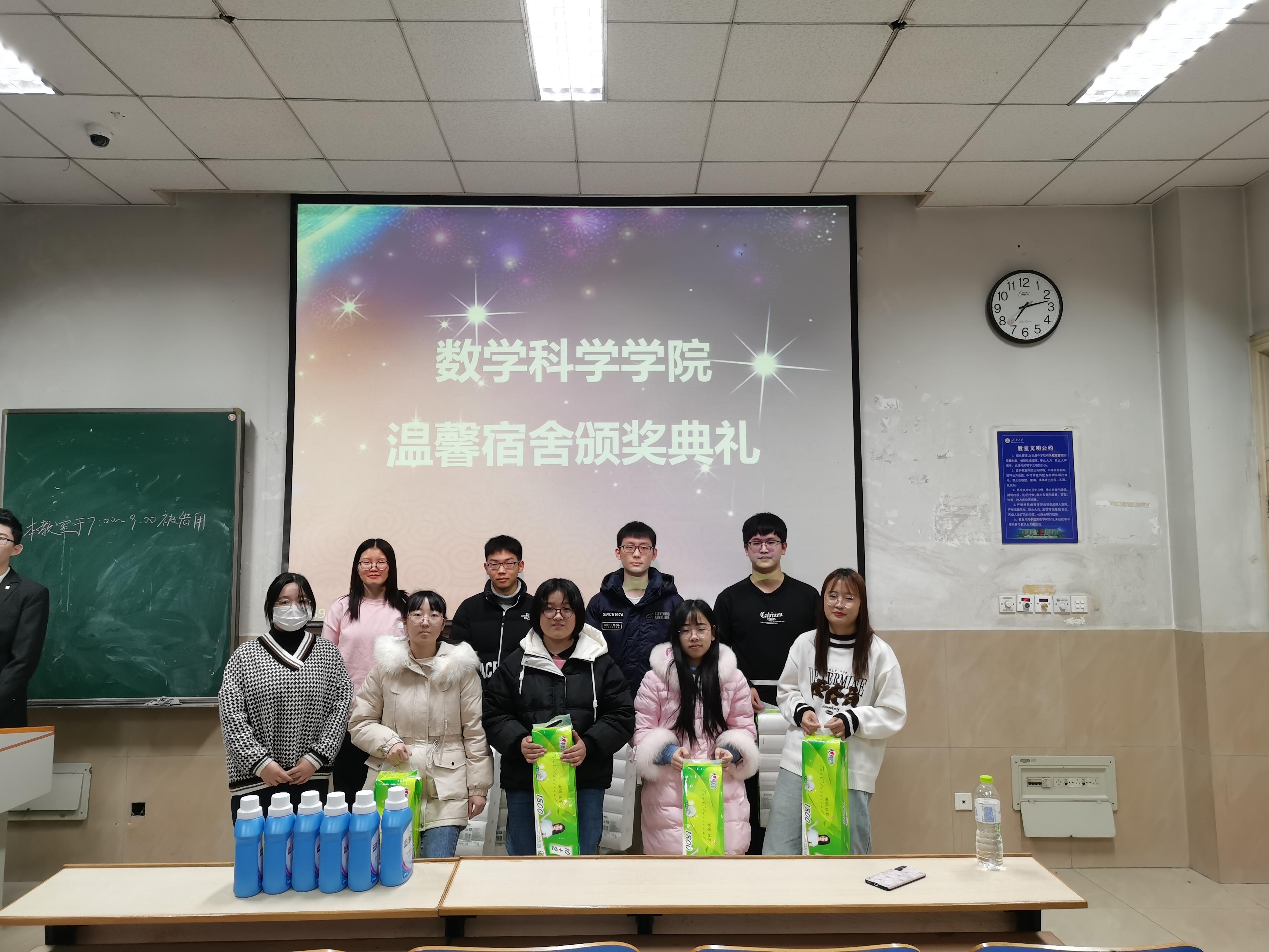 大会开始前,社管部的工作人员提前布置好现场,并准备好了奖状及礼品。随后,各宿舍代表有序签到。晚上七点,大会准时开始,主持人依次宣布了一等奖、二等奖、三等奖的获奖宿舍名单,全场响起热烈的掌声。紧接着,获奖宿舍代表在主持人的引领下上台领奖,并合影留念。他们表示他们会再接再厉并坚决维持好宿舍卫生。房琳琳老师首先肯定了这次温馨宿舍评选中每个同学的努力成果,并在对这次评选的总结时说:寒假即将来临,为了避免宿舍中虫害滋生现象出现,让同学们生活的更加舒适温暖,一定要保持宿舍整洁。宿舍代表纷纷表示赞同,并表示愿意督促其他同学一起维护好宿舍卫生。此次颁奖活动在各人员的配合下圆满结束。
