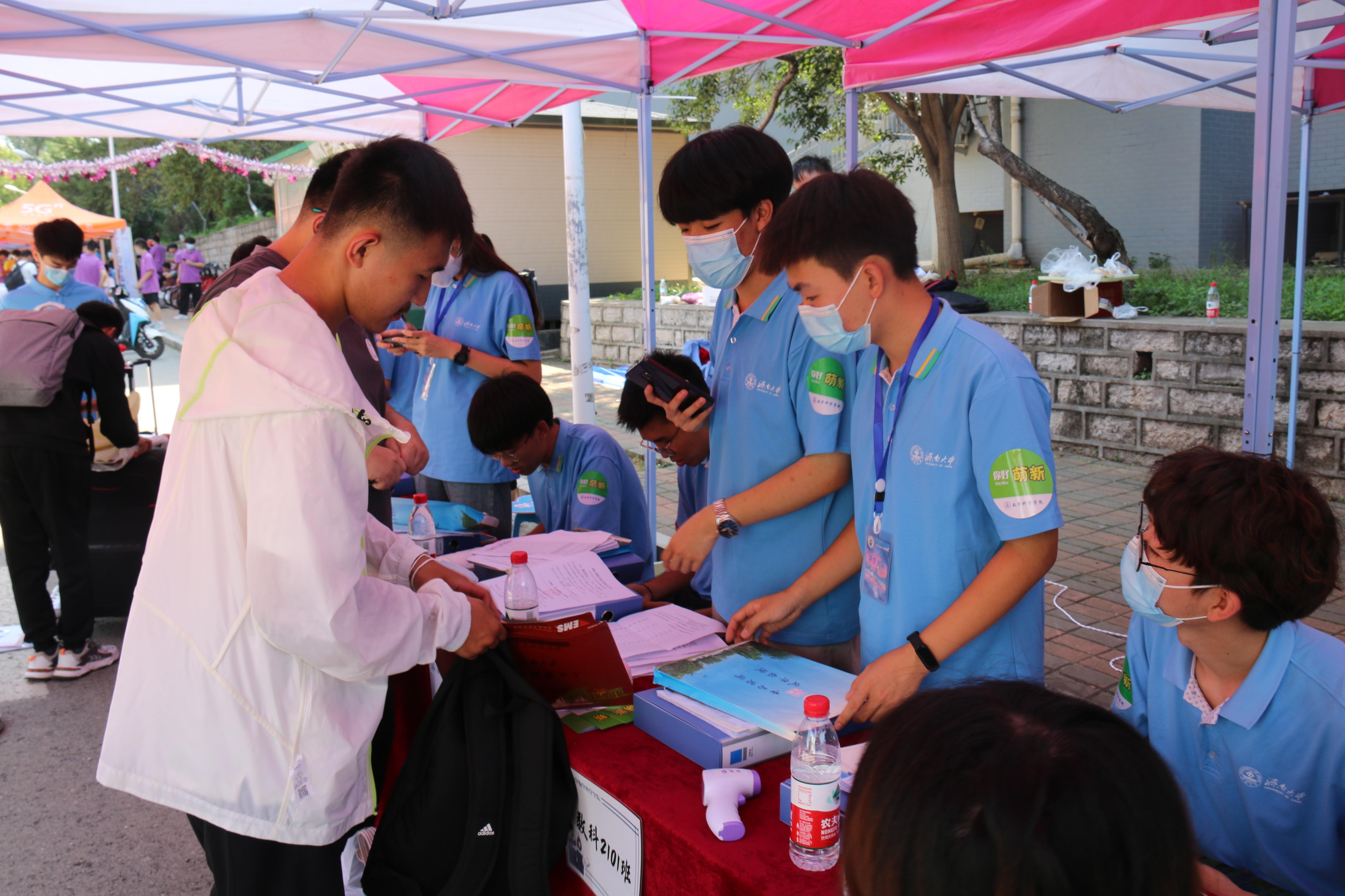疫情防控常态化要求下,萌新们由学院志愿者引导进入校园、出示健康码、测量体温。进入校园后,学院的志愿者帮助新生搬运行李,并引导新生前往学院报到点完成报到手续。报到过程井然有序,迎新工作如火如荼。展板、横幅把迎新点装扮一新,新生通过查验录取信息、材料收取、信息采集等步骤完成现场报到,领取专属于数院人的入学文件袋与钥匙扣,正式成为数院的一员。