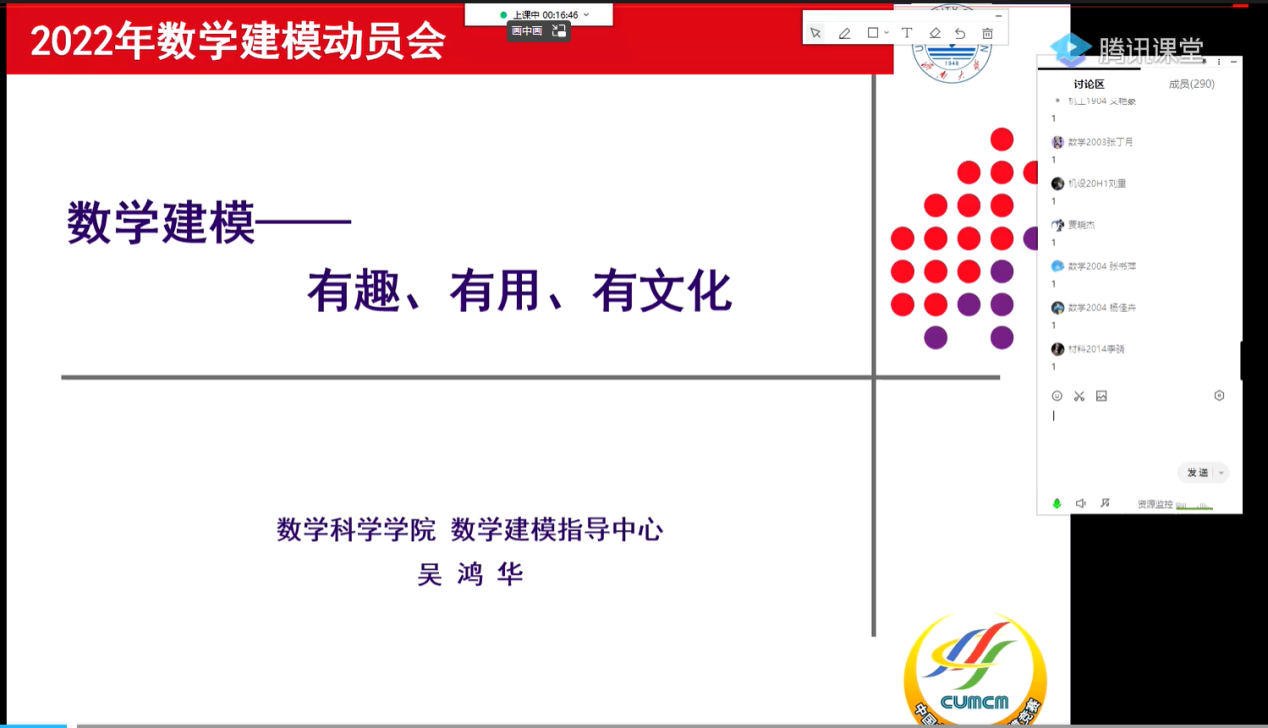 为助力我校学子了解数学建模、提高数学学习兴趣、培养数学应用实践能力,ok138cn太阳集团古天乐于3月15日下午线上举办了2022年大学生数学建模竞赛培训动员大会。本次大会由ok138cn太阳集团古天乐数学建模中心主任吴鸿华副教授主持,来自我校各院300余名优秀学子参加了会议。