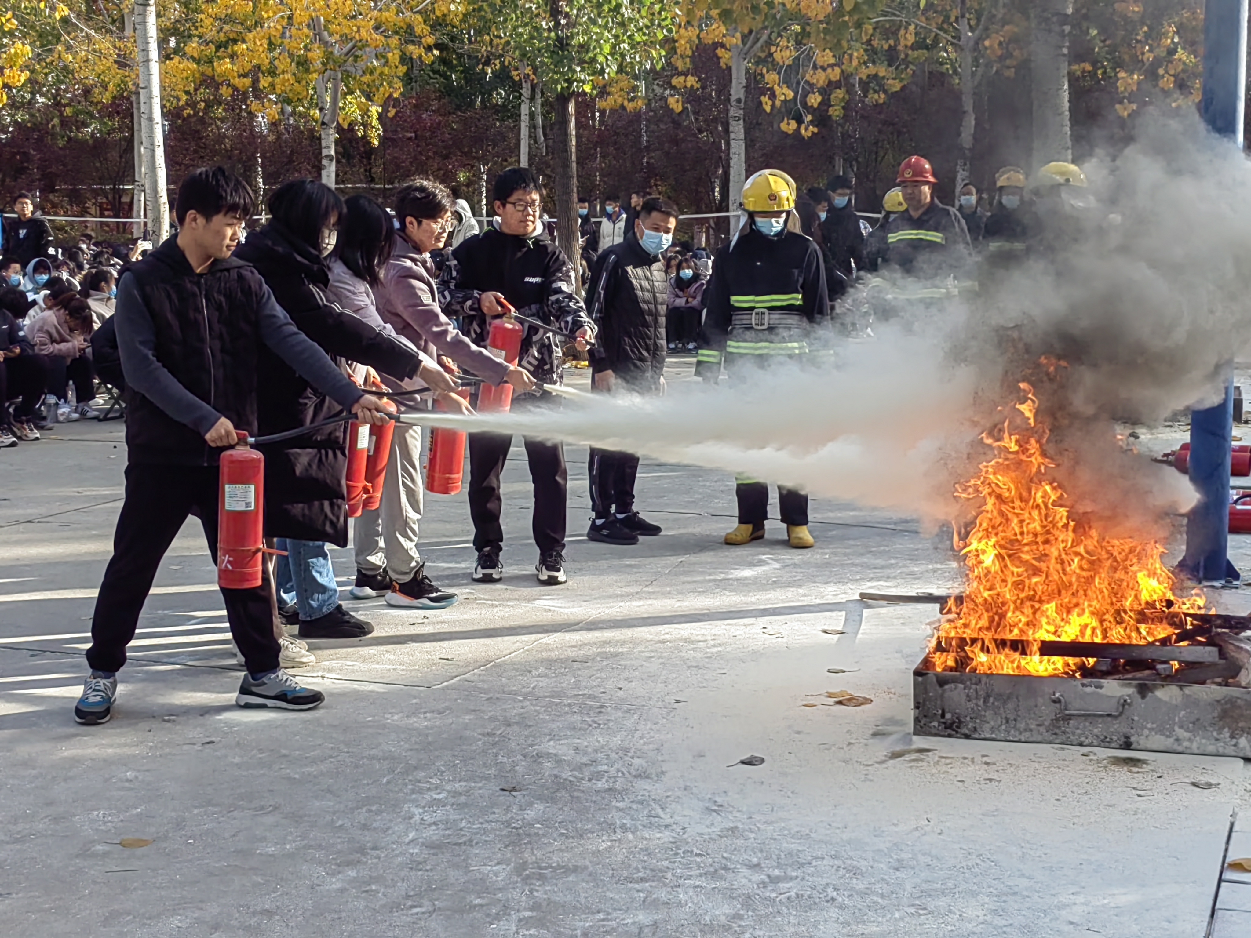 活动伊始,学校请到了济南市消防大队队长为学生们讲解消防安全知识,针对如何扑救初期火灾、发生火灾后应该如何报警以及如何组织火场疏散逃生等注意事项进行了强调,并提醒大家从源头上杜绝安全隐患,提升安全意识。期间,消防安全培训员向全体同学讲解了灭火器的正确使用方法和注意事项,在消防安全培训员的指导下,学生们亲身体验按照步骤对灭火器的使用进行现场实操,干粉灭火器消灭火焰的同时学生们的消防意识和能力也得到了提升。