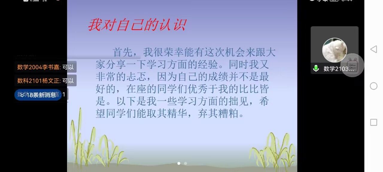 活动以腾讯会议的形式在线上召开。我院邀请了优秀的高年级学长学姐针对科研立项、考研、四六级、考证等大学学习生活方面的问题为同学们解答疑惑,以此为同学们学业以及生涯规划提供了开阔的思路。会议伊始,学长学姐们以自己独特的学习经历以及幽默的话语安抚了新生们不安的心,为接下来的述说营造氛围。对于同学们在大学四年的每个阶段应当提前做好哪些准备学长学姐们做了十分详细的讲解,他们通过分享自己的学习经验,着重为同学们讲解了在学习过程中应如何提升自己的学习效率以及怎样制定学习计划,让同学们受益匪浅。学长学姐们想通过将自己的经历化作宝贵的经验分享给大家的方法,帮助同学们明确大学期间的目标和方向,增进了学院温暖和谐的学习氛围,形成了互帮互助的良好风气。