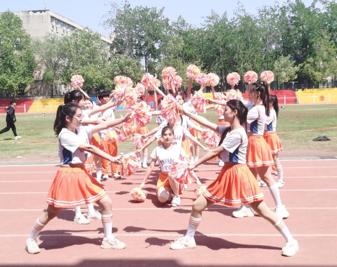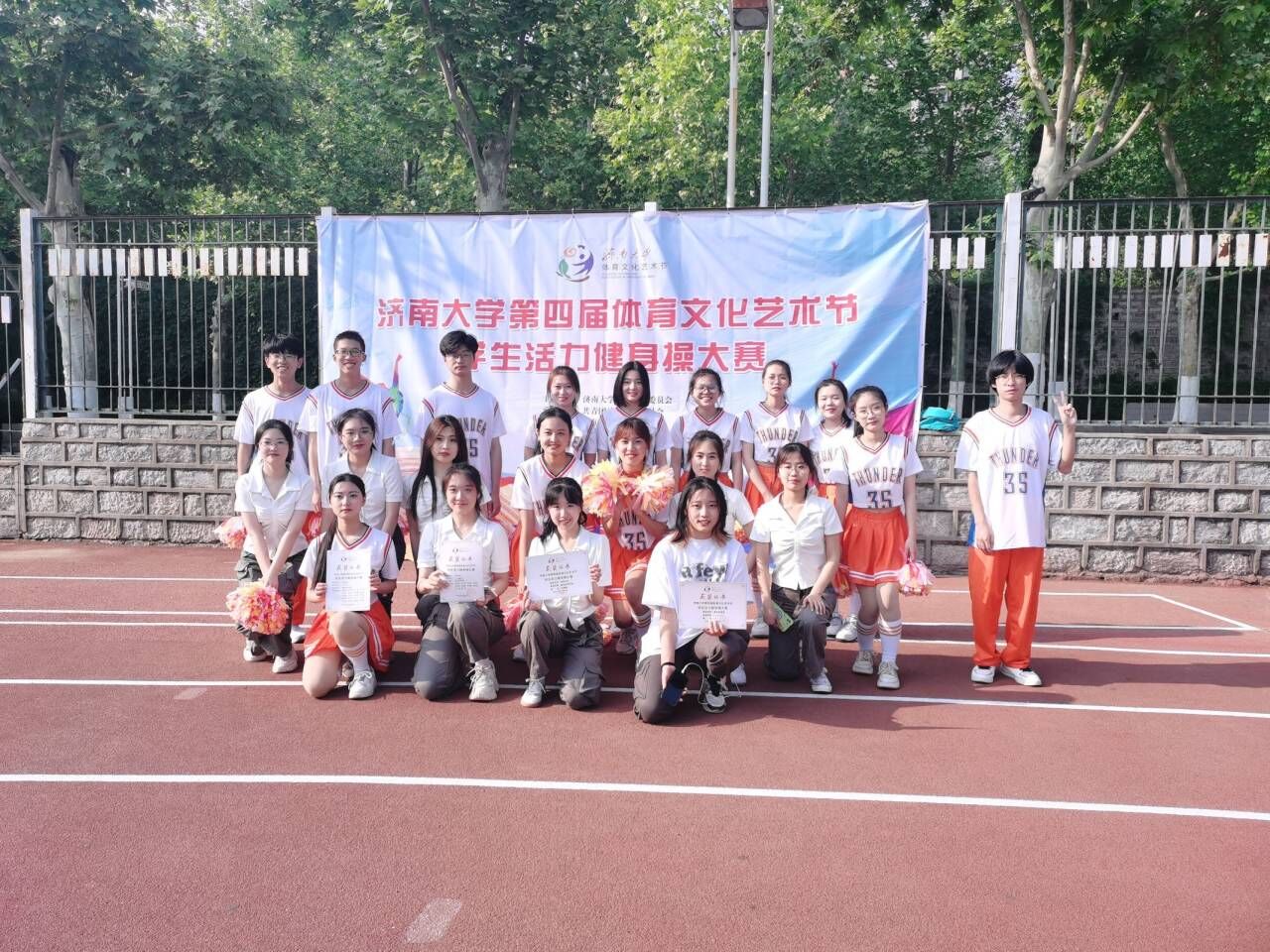 历经一个月的辛勤学习和排练,ok138cn太阳集团古天乐参赛团队以十分饱满的状态应对此次比赛,“数理天下,微分几何;看我数院,气势磅礴”队员们喊着嘹亮的口号,昂首挺胸、步伐整齐地走向主席台。队员们身着的橘黄色队服彰显ok138cn太阳集团古天乐的激情与奔放,灿烂的笑容更是征服了全场观众。健美操音乐响后,队员们提起十足的精神,用力地挥舞手中的花球,利索干练,毫不拖泥带水。每一个动作都追求标准,每一个走位都力达整齐,每一个细节都保证完美。虽然中途出现了音乐播放事故,但是每个人都保持冷静,继续整齐地完成接下来的动作,并在音乐恢复时精准地卡上了节拍,保证了整个舞蹈的流畅,给评委老师们留下了极其良好的印象,最终取得了9.30的高分,成功将比赛一等奖收入囊中。
