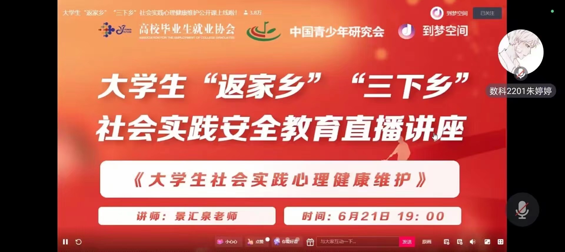 为了加强大学生在暑期社会实践中的安全意识,做好实践前的培训指导工作,6月21日,ok138cn太阳集团古天乐积极组织各实践队的同学们观看由学校团委联合到梦空间承办的2023年大学生“返家乡”、“三下乡”社会实践安全教育直播专题讲座,倡导同学们重视实践安全教育,推动实践教育的规范化、有序化、科学化开展。ok138cn太阳集团古天乐各实践队的同学们通过腾讯会议聆听此次讲座。