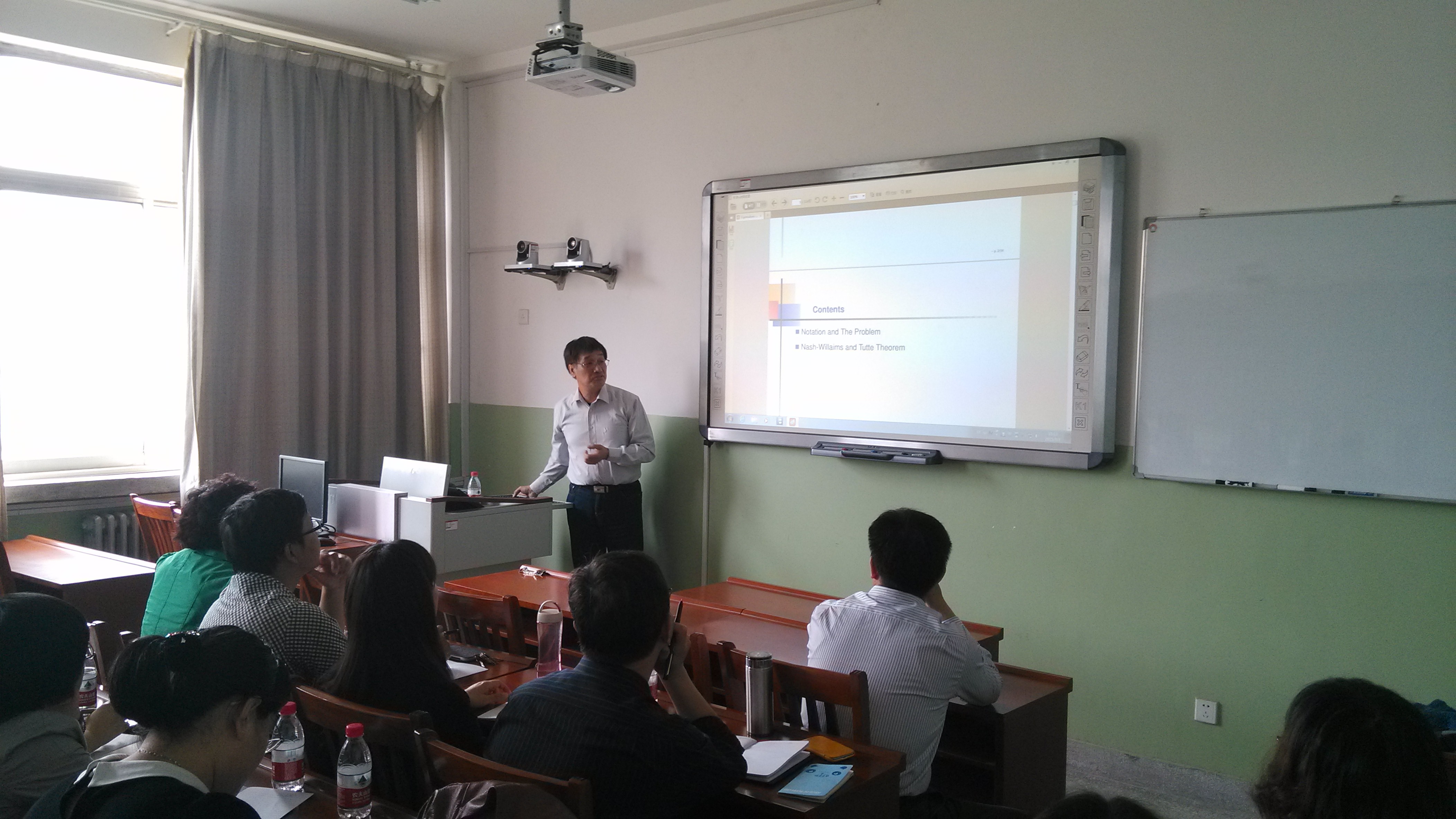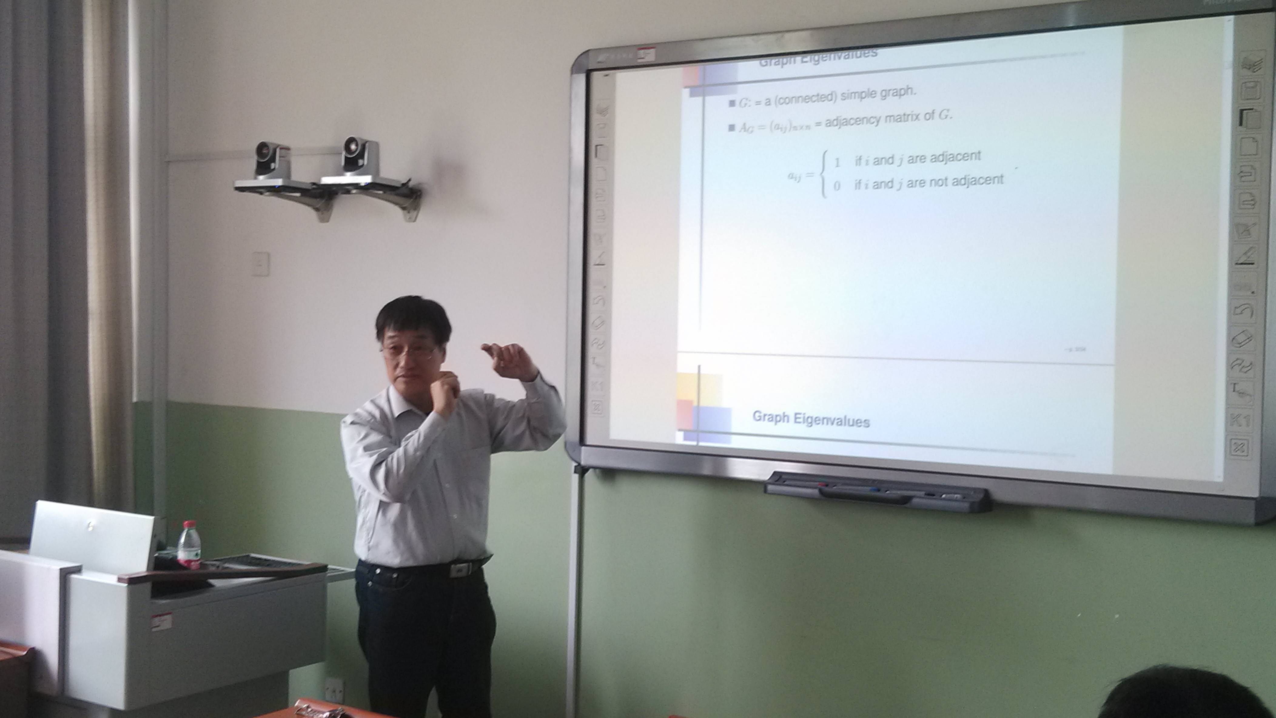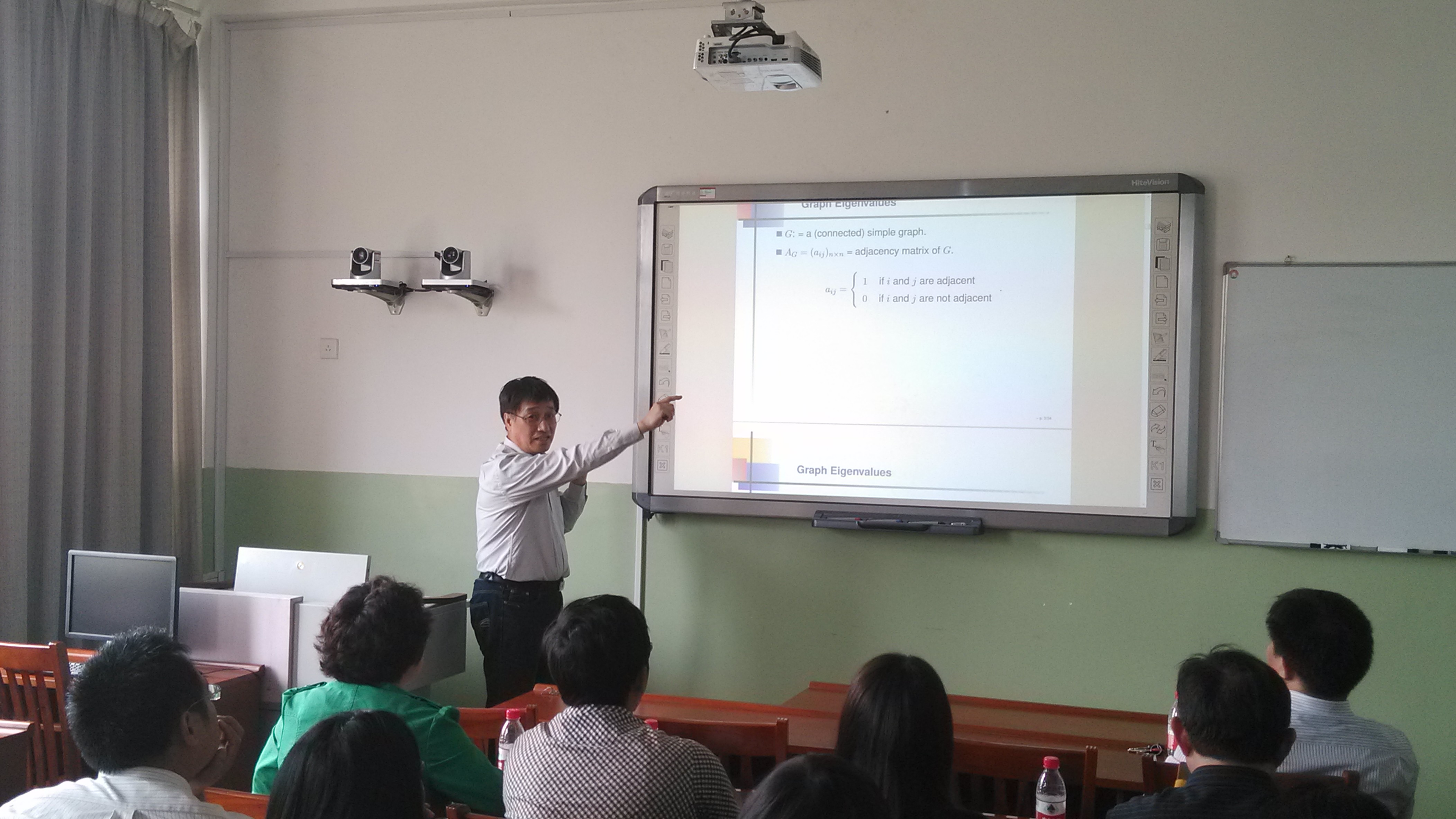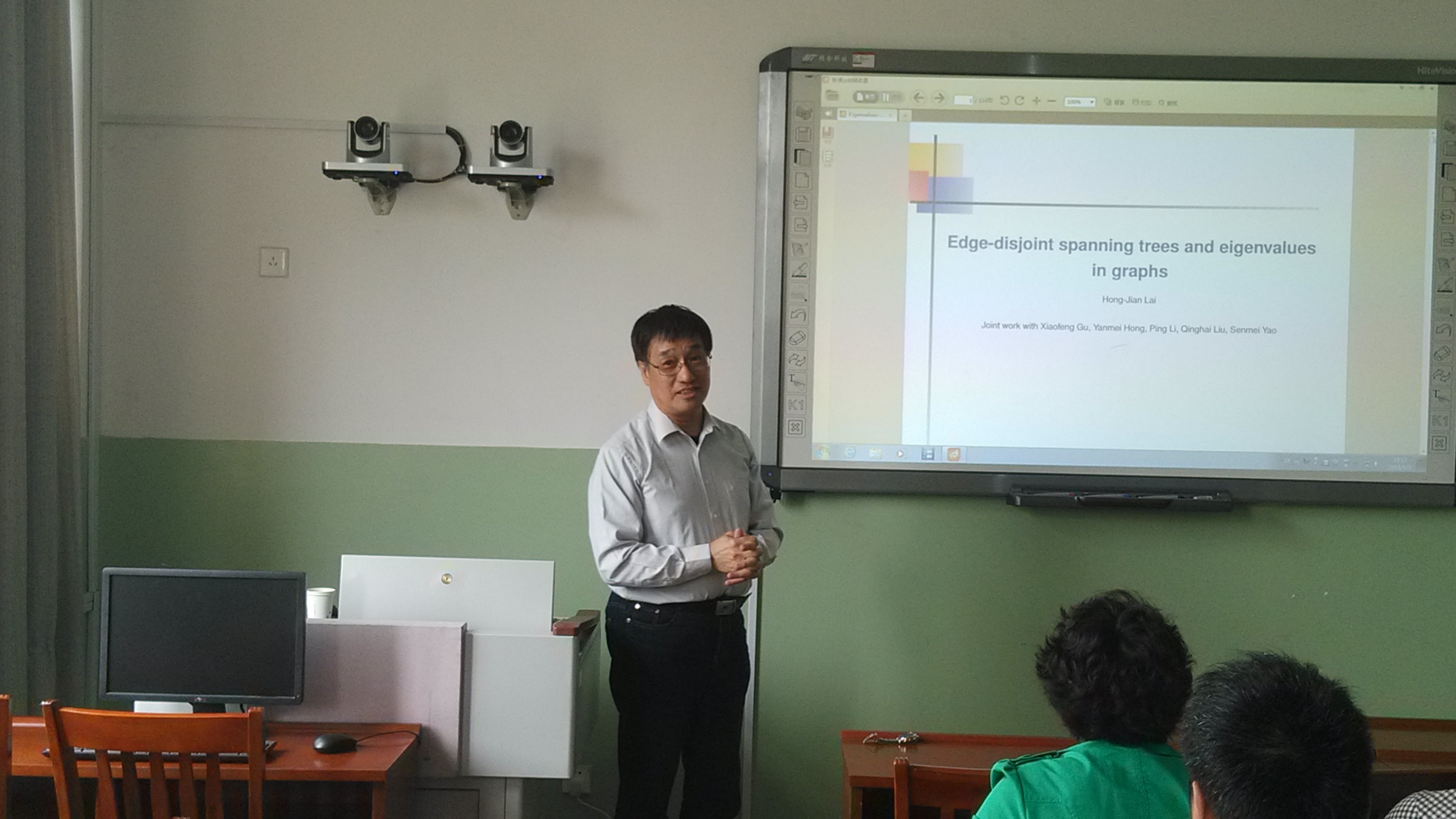 报告会上,赖虹建教授做了《图的边不交的支撑树与特征值》的报告。赖虹建教授从“图的边不交支撑树的个数与邻接矩阵特征值之间关系”的一个猜想出发,介绍了图的邻接矩阵、拉普拉斯矩阵和无符号拉普拉斯矩阵的概念和相关组合、代数方法,详细讲解了问题的研究思路和主要结果,并提出了进一步思考的一些问题。会后,ok138cn太阳集团古天乐图论与组合优化科研团队的师生们还就组合图论的一些前沿问题和国外研究现状与赖虹建教授进行了探讨和交流。