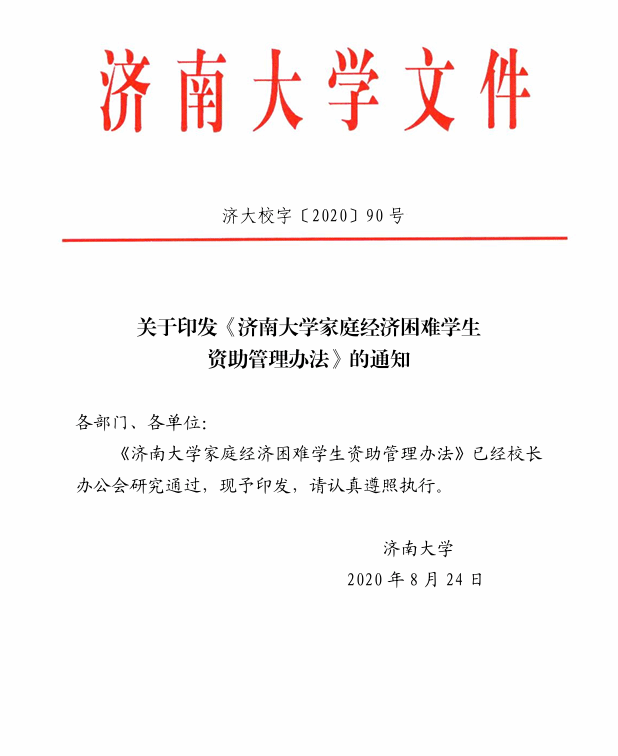济大校字〔2020〕90号-关于印发《ok138cn太阳集团家庭经济困难学生资助管理办法》的通知
